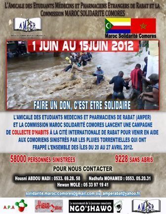 La Commission Maroc Solidarité Comores, mise en place par l'Association Agir Pour Anjouan à Rabat le 05 mai 2012, lance une campagne de collecte d'habits à la Cité Internationale de Rabat pour venir en aide aux comoriens sinistrés par les pluies torrentielles qui ont frappé l'ensemble des îles du 20 au 27 avril 2012.